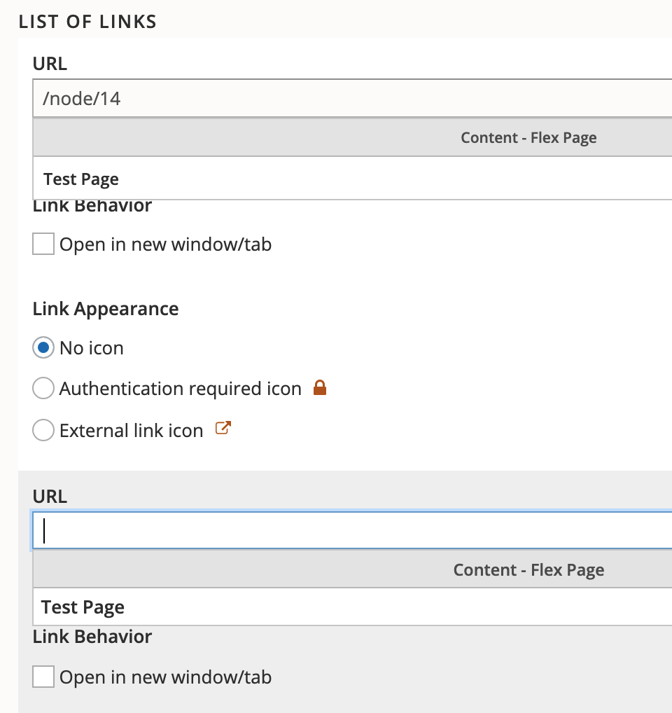 While testing this release, ITS noted that the autocomplete input for links, updated in the beta.5 release, will erroneously offer to autocomplete multiple adjacent fields (see screenshot below). Content editors should be aware of this and ignore the additional autocomplete suggestions not related to the input field they are editing. ITS plans to remediate this issue in the upcoming release.